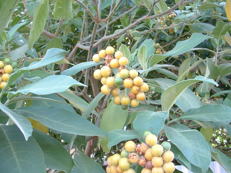 A kerosene/capsicum-smelling shrub or small tree, growing up to 10m tall, with whitish, branching soft-woody stems. All parts covered in dense felt-like hairs. The large velvety, oval leaves (10-35 x 3-15 cm), are grey-green on the upper surface, and white to yellowish underneath with prominent ‘ears’ (25mm) at base which clasp the stem. Produces dense clusters of mauve to purple flowers (15-20 mm diameter) with yellow anthers, followed by clusters of round berries (1 cm diameter) that ripen from hard green to soft, dull yellow and whitish, branching, soft-woody stems.